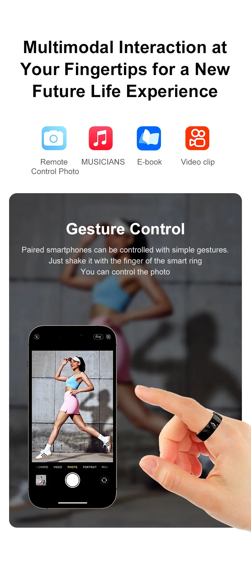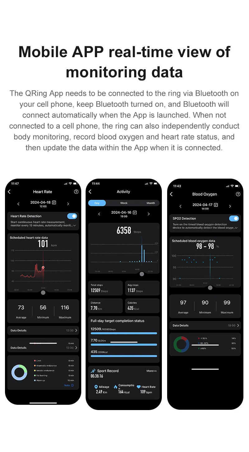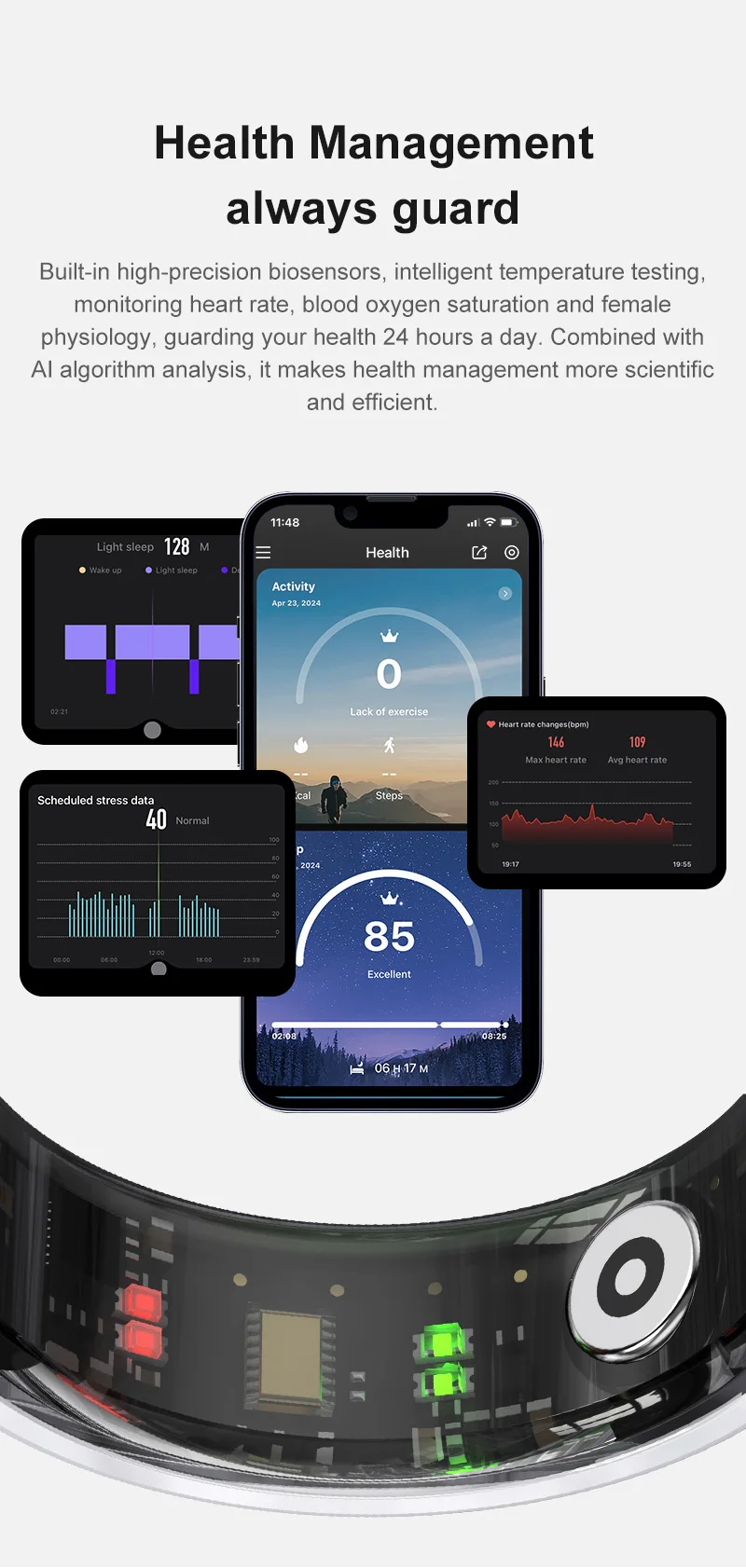 Ringen mäter steg, distans och kalorier samt viktiga hälsodata som hjärtfrekvens, sömn, stressnivå och syremättnad i blodet (SpO₂). Den stödjer även NFC, flera sportlägen och smarta funktioner som musikstyrning och fjärrutlösare för kamera.